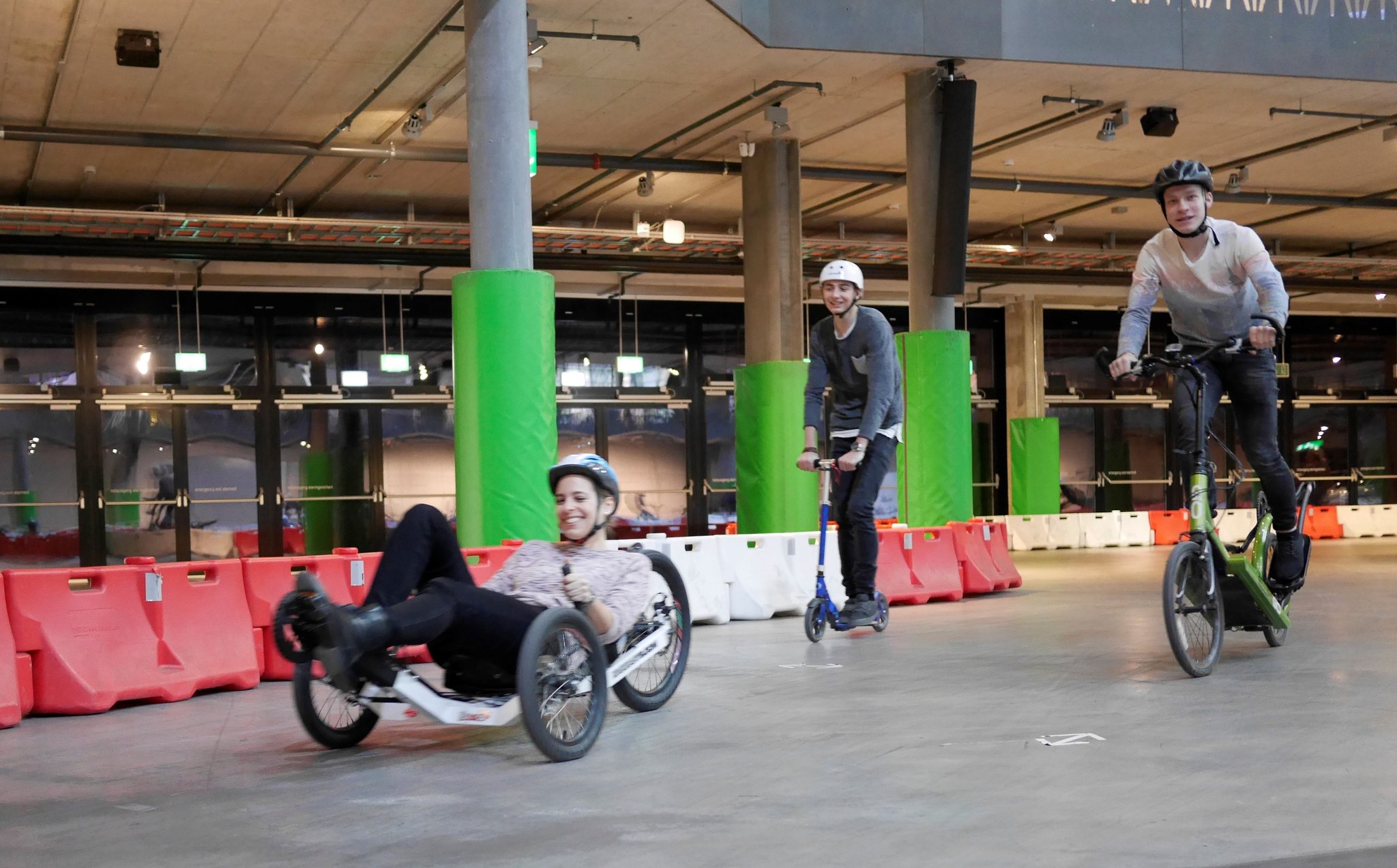 So oder so kannst du im zweiten Teil des Kurses eine Vielzahl von speziellen Velos, Tretkarts und Trottinetts und allerlei überraschenden Fahrzeugen im Indoor Parcours probefahren.