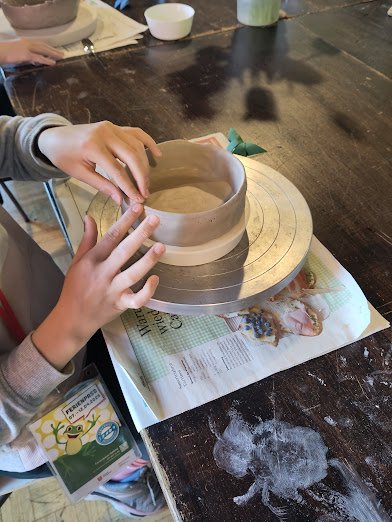 Aus einer Kugel Ton pinchen (deutsch: Daumendrucktechnik) wir eine Müeslischale. Diese kann mit Stempel oder Spitzendeckchen verziert werden.